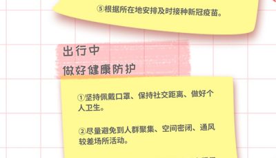 出行前:进行风险评估等准备当前境外多国疫情严重,个人出境旅行感染风险高。根据各地防控政策,入境人员须提供严格的双阴性检测证明,入境后需集中隔离观察14天外加健康随访。因此建议个人充分权衡出行时机和必要