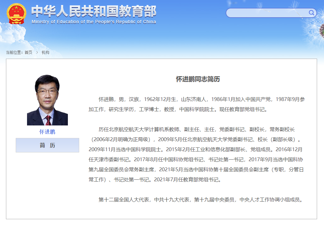 教育部官网截图人民网北京8月2日电今天,教育部官网“教育部领导”栏目显示,怀进鹏已任教育部党组书记。根据公开的简历,怀进鹏曾任北京航空航天大学党委副书记、校长,2009年当选中国科学院院士。2015年