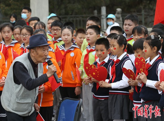 5月16日,北京市丰台区卢沟桥,时代楷模、“七七事变”亲历者郑福来向小学生讲述革命故事。当日,来自周边数所小学的师生代表来到这里,与居民一起唱响爱国歌曲。近日,丰台区开展中小学校百年百团唱百歌系列