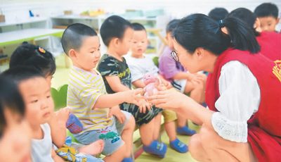 在浙江省杭州市临安区一家幼儿园,锦城街道胜利社区的青年社工通过玩游戏的方式向小朋友普及日常安全知识。 新华社记者徐昱摄 “啥时候要娃”“家里孩子谁带”“准备生二孩吗”……这类追问,年轻夫妻并不