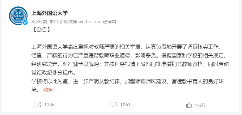 人民网北京11月24日电(记者郝孟佳)近日,上海外国语大学一女生举报该校教师严�X隐瞒已婚已育事实,与其发展不正当关系,并骚扰多名在校女生。23日晚,上海外国语大学发布公告称,经查,严�X的行为已严重违背