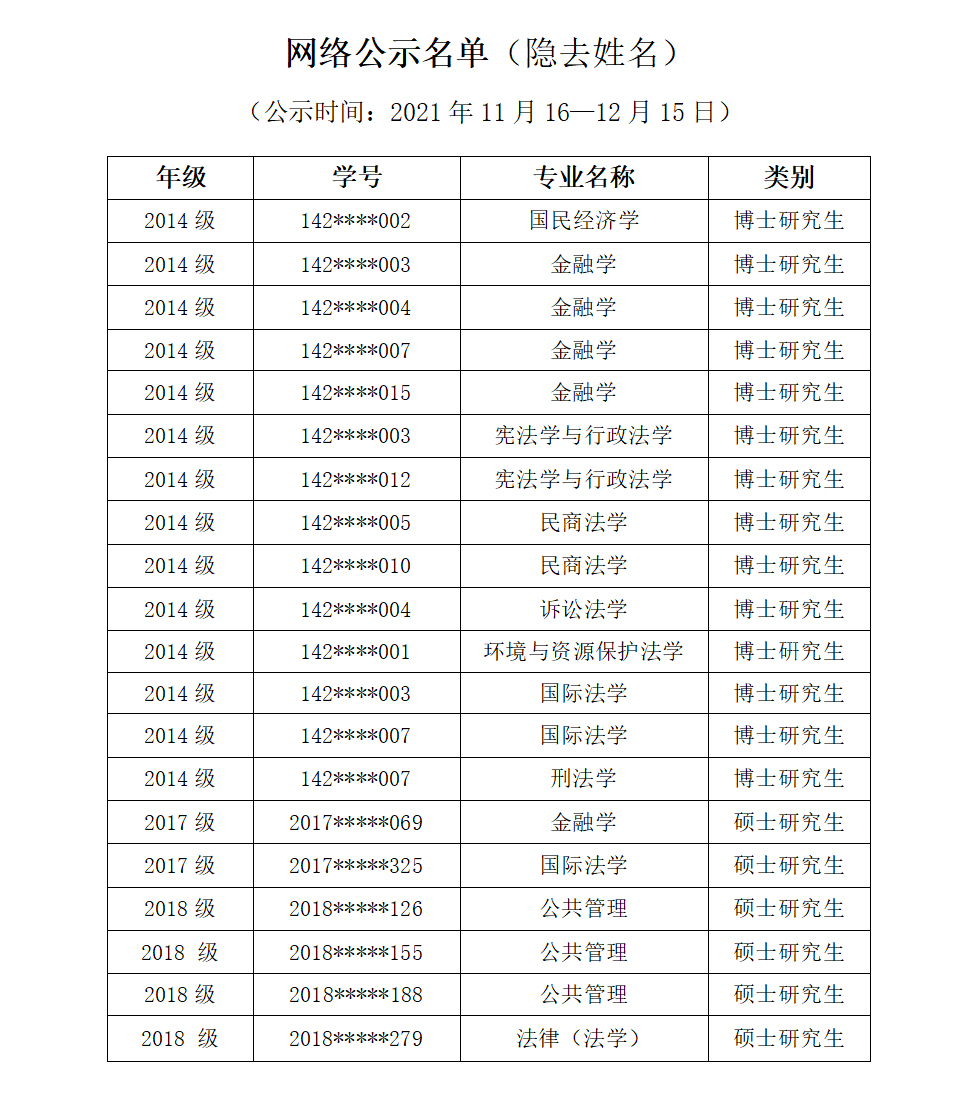 人民网北京11月23日电记者从中南财经政法大学获悉,近日,该校研究生院发布了《关于拟对超过最长学习年限研究生退学处理的公示》(下称“公示”),拟对学校20名超过最长学习年限的研究生采取退学处理,其中1