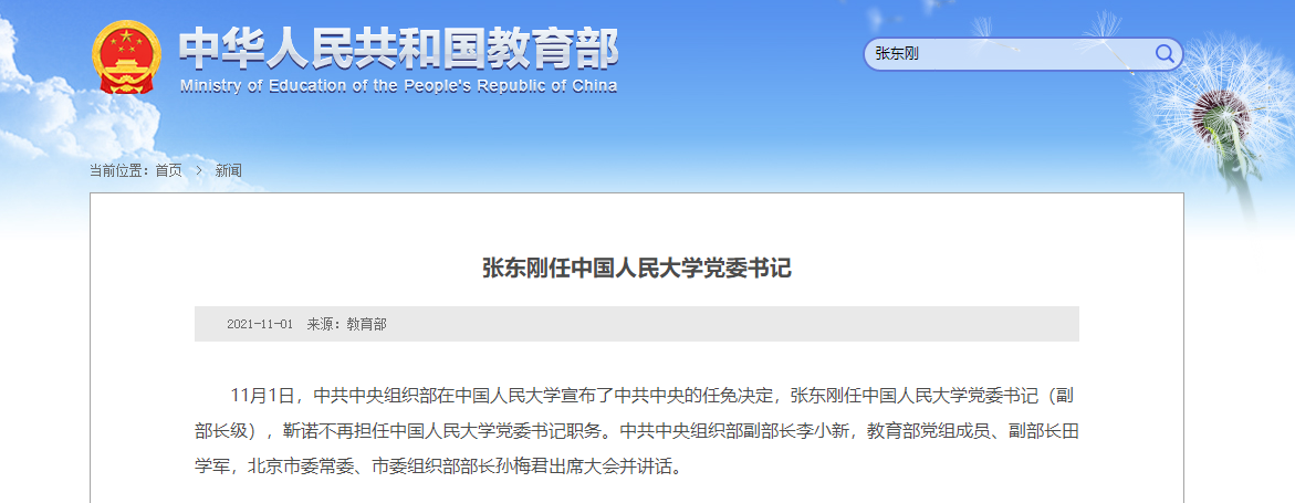 人民网北京11月1日电(记者郝孟佳)据教育部官网消息,今天,中共中央组织部在中国人民大学宣布了中共中央的任免决定,张东刚任中国人民大学党委书记(副部长级),靳诺不再担任中国人民大学党委书记职务。中共中