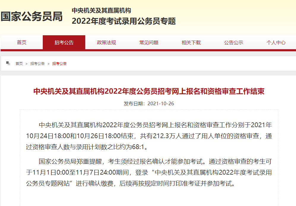 人民网北京10月27日电(记者郝孟佳)据国家公务员局网站消息,中央机关及其直属机构2022年度公务员招考网上报名和资格审查工作分别于2021年10月24日18:00和10月26日18:00结束,共有2