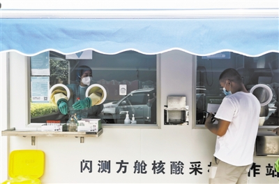 日前,在北京市朝阳区街头,一款名为“闪测方舱核酸采样工作站”的核酸检测方舱设立路侧。市民不需要预约,带上身份证,就可以前来检测核酸,通过手机扫码和相关App完成缴费和核酸检测结果查询,24小时内出