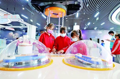 2021年12月17日,在广西柳州科技馆,学生们在操控和体验科学仪器。当日,2021年柳州科技馆“科技研学,让课本知识‘活起来’”研学实践教育活动开课,地处偏远山区的柳州市融安县大坡乡岗伟村小学壮