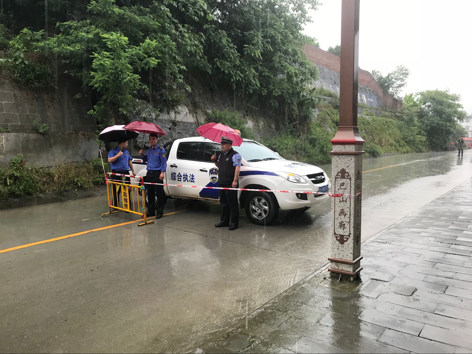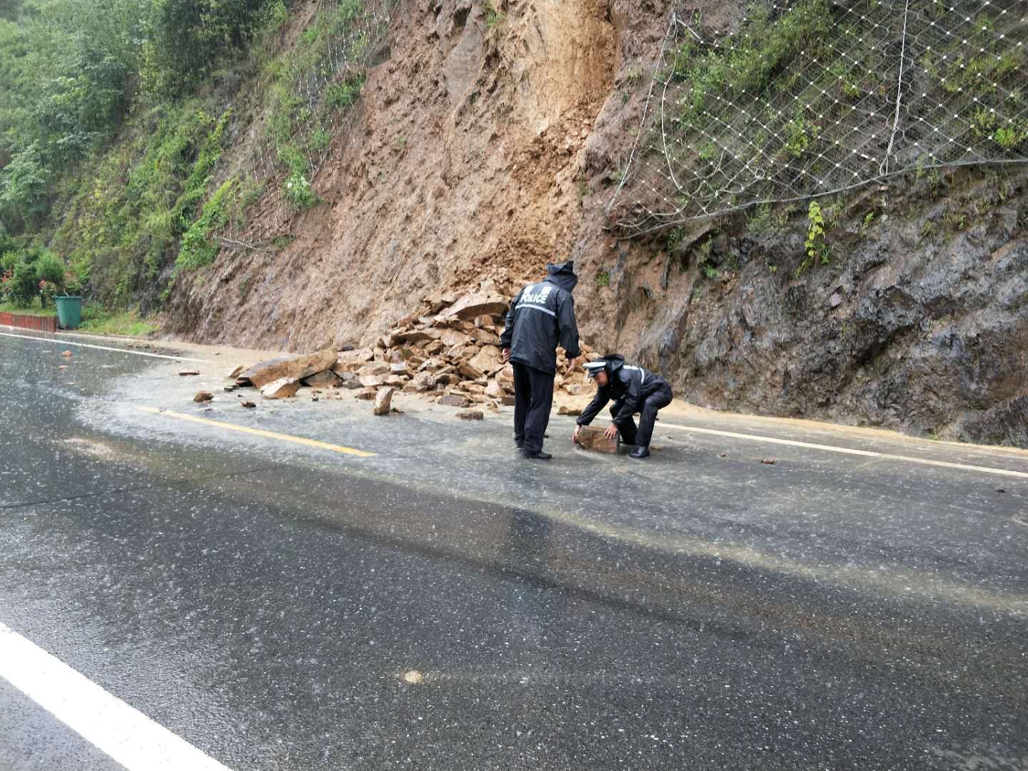 民警一方面在暴雨中坚守岗位,对危险隐患路段进行必要的交通管制,设立警示标志,并指挥现场车辆有序、安全通行,避免出现拥堵和人流滞留现象。另一方面联合路政及相关部门对塌方现场进行清理。并及时编发路况信息在959电台、微信、微博等媒体平台进行广泛宣传告示,提示广大群众注意绕开危险路段安全出行。全力保障险情下交通安全,确保人民群众的生命财产安全。
