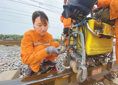 “这一段钢轨探伤仪显示波形异常,再走一遍……” “这个位置,打个记号……” 在中国铁路太原局集团有限公司秦皇岛西工务段西张庄探伤车间,有一支女子探伤队。39岁的谢小伟(上图。本报记者史自强摄)