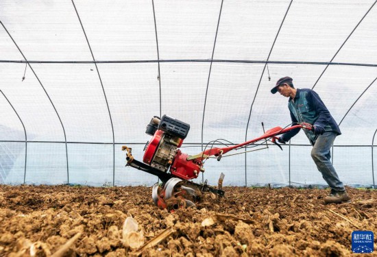 11月16日,村民在黔西市文峰街道三角社区羊肚菌种植基地进行土地翻耕。 近日,贵州省黔西市利用秋收后空闲土地进行作物轮种,采用“合作社+公司+农户”的方式大力发展羊肚菌种植,截至目前全市共完成种
