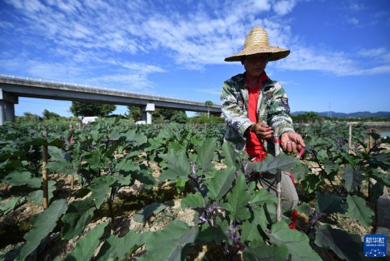 11月16日,三亚市崖州区的农民在管护茄子田。 初冬时节,海南进入冬季瓜菜种植期,田间地头都是农民们劳作的身影。据了解,2021至2022年度,海南冬春瓜菜种植面积力争稳定在290万亩。 新华
