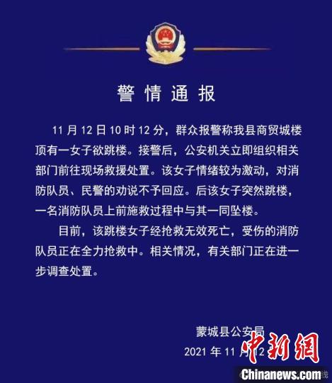 警方通报蒙城县公安局官方微博安徽省亳州市蒙城县公安局官方微博13日通报称,11月12日10时12分,群众报警称该县商贸城楼顶有一女子欲跳楼。接警后,公安机关立即组织相关部门前往现场救援处置。该女子情绪