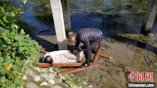 伍波正在对坠河老人紧急施救。王涛摄“快来人啦!有人掉到河里啦!”9日13时许,在成都市高新区天府三街和天府四街之间的花荫沟人行栈道上,突然传来呼救的声音。此时,邮储银行四川省分行员工伍波恰好路过此处,