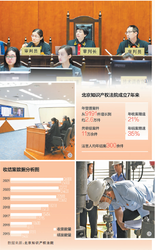 图①:北京知识产权法院开庭现场。 图②:北京知识产权法院互联网法庭庭审现场。 图③:技术调查官协助勘验事项。 资料图片 知识产权司法保护是国际通行的知识产权保护体系中的重要力量,在促进建设