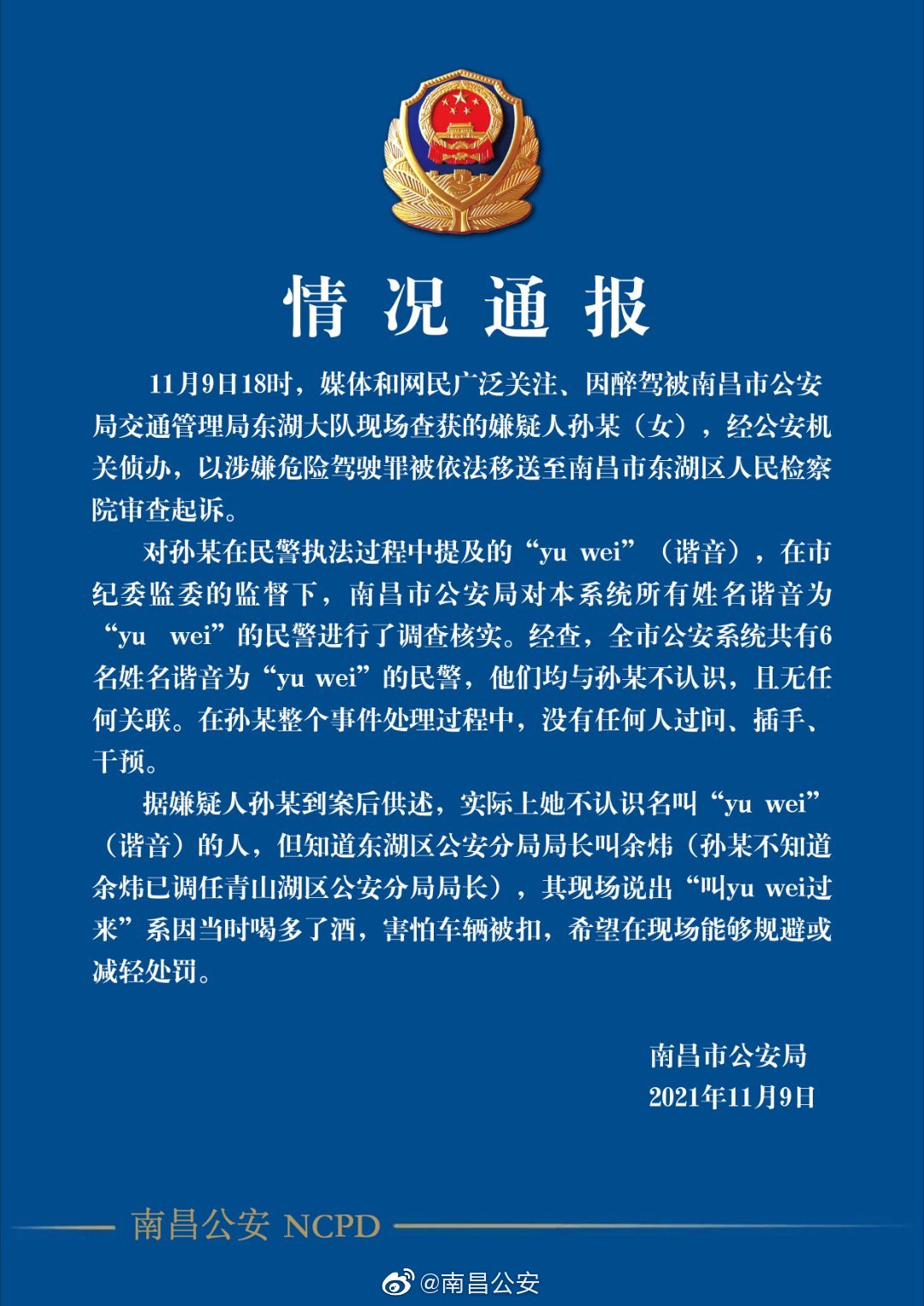 人民网北京11月10日电(吴楠)日前,江西南昌一女子因醉驾被查,不配合执法,还多次拿起手机想找“yuwei”,公安机关对此依法刑事立案,引发关注。11月9日晚,江西省南昌市公安局通报醉驾女子喊“yuw