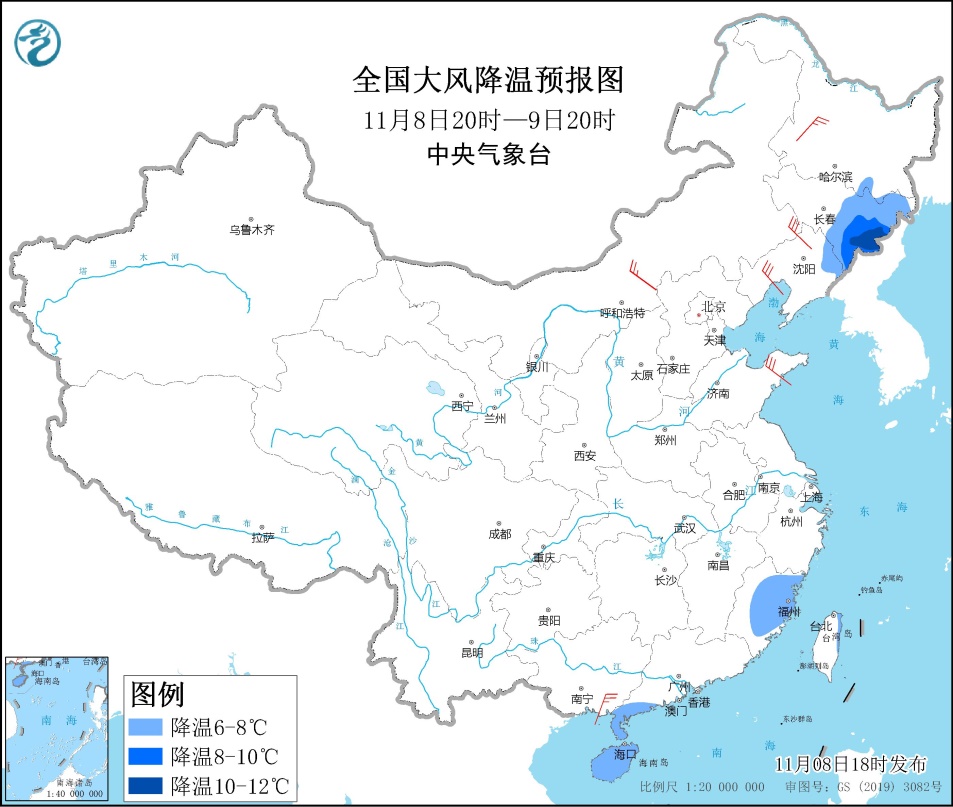 人民网北京11月8日电(记者温璐、郝孟佳、孙竞)据中央气象台消息,受寒潮影响,预计11月8日20时至9日20时,东北地区中东部、福建中东部及海南岛等地部分地区将出现6~8℃降温,其中吉林东部局地降温幅