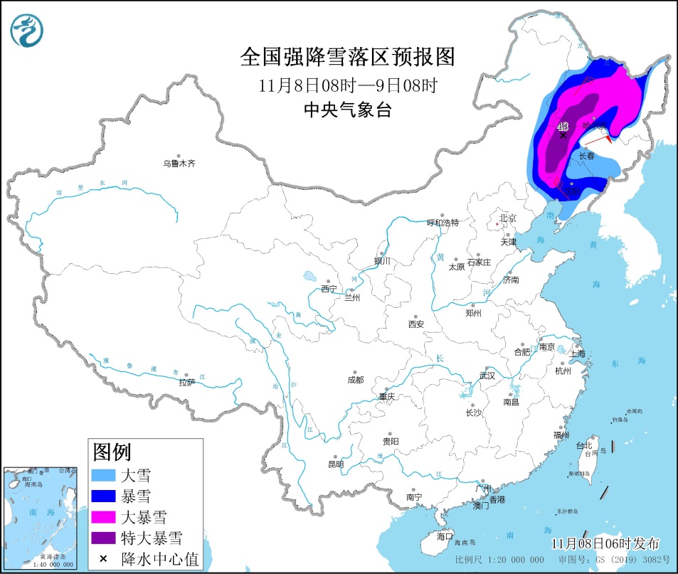 人民网北京11月8日电(记者孙竞、郝孟佳)今天,中央气象台发布暴雪橙色预警。预计11月8日08时至9日08时,内蒙古东南部、辽宁、吉林西部和南部、黑龙江中部和西南部等地的大部分地区有大到暴雪,其中,内