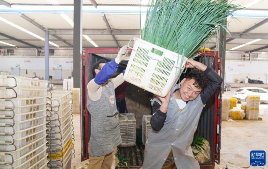 11月6日,通海县的菜农在蔬菜批发市场搬运青蒜。 云南省玉溪市通海县是云南省主要蔬菜集散地之一,也是我国“南菜北运”“西菜东运”的重要基地,每天都有数百辆满载蔬菜的货车从通海出发,驶往全国各地。
