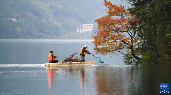 11月6日,在常宁市天堂湖,工作人员在湖面上打捞树枝落叶等漂浮物。 受近期连续降雨影响,湖南省衡阳市常宁市境内河流水库枯枝、树叶等漂浮物增多,当地及时开展清漂工作,确保水面清洁、水质优良。 新