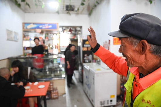 10月28日,在孙记面馆,环卫工人赵三小(右)吃完面后与面馆老板孙桂林告别。山西朔州有一家面馆,常年向环卫工人提供3元一碗的手擀面,这一爱心之举坚持了11年。新华社记者柴婷/摄 来源:中国青年报