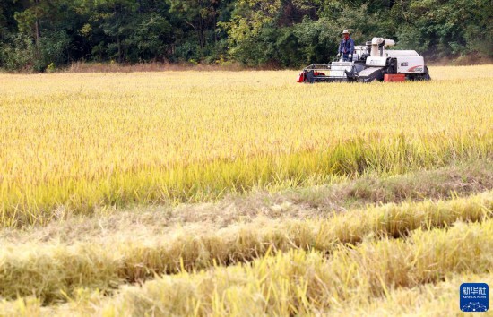 10月28日,在江苏镇江句容市天王镇戴庄村,农民驾驶收割机收割稻子。 秋收时节,江苏镇江句容市天王镇戴庄村的农民抢收稻子,确保颗粒归仓。 新华社发(钟学满摄) 10月28日,在江