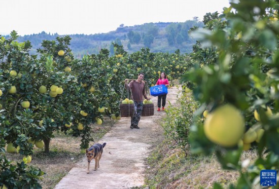 10月25日,贵州省铜仁市玉屏侗族自治县朱家场镇前光村村民在挑运柚子。 金秋时节,贵州省铜仁市玉屏侗族自治县种植的柚子迎来丰收,当地村民抓紧采摘、分拣、挑运柚子,供应市场。近年来,玉屏侗族自治县