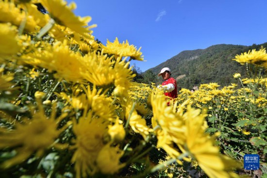 10月25日,村民在湖北省襄阳市保康县黄堡镇大屋场村金丝皇菊种植基地采摘金丝皇菊。 近日,湖北省襄阳市保康县黄堡镇大屋场村金丝皇菊种植基地的金丝皇菊进入采收期,农民趁晴好天气,抢抓农时采摘、分拣