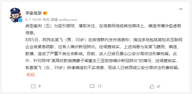 日前,北京市公安局通报了一批涉疫典型案例。其中一则案例显示,网民朱某飞(男,30岁)在微信群内发布信息称,海淀多地包括某知名互联网企业被紧急疏散,应有人确诊新冠肺炎。经调查核实,上述消息为朱某飞臆测、