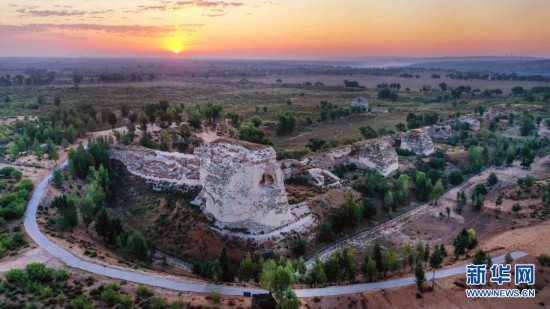 日出时统万城的断壁残垣(8月9日摄,无人机照片)。 匈奴都城遗址统万城位于陕西省榆林市靖边县境内,受恶劣生态环境影响,曾经的城池遗存遭到风雨流沙侵蚀,一度掩埋于沙漠之下。如今,经过几代人治沙,当