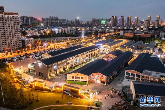 这是8月7日拍摄的合肥市瑶海区长江180艺术街区夜景(无人机照片)。 安徽省合肥市瑶海区长江180艺术街区所在地原是一片工业厂房,为有效利用老工业厂房,保留工业文化特色,当地在旧厂房改造升级过程