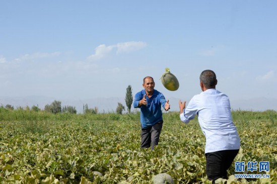 在伽师县卧里托格拉克镇的瓜田里,瓜农在采摘伽师瓜(8月4日摄)。 近日,地处塔克拉玛干沙漠南缘的“中国伽师瓜之乡”新疆伽师县20余万亩伽师瓜成熟上市。新疆最大的伽师瓜交易中心――新疆果品(伽师)