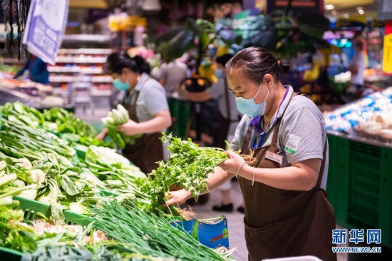 8月5日,在张家界市永定区步步高超市十字街店,工作人员为订货市民挑选蔬菜。 近日,为应对当前疫情形势,湖南省张家界市多渠道积极调配物资,保障市场供应。据了解,目前当地粮油等生活物资储备充足、供应
