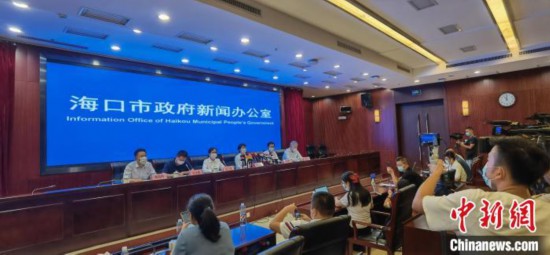 图为8月5日晚海口市新型冠状病毒感染肺炎疫情防控新闻发布会现场。 尹海明 摄 中新网海口8月6日电(记者尹海明)海口市卫健委主任潘文利5日晚在海口市新型冠状病毒感染肺炎疫情防控新闻发布会说,初步