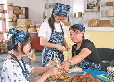 草编培训班老师吴云苹(右一)在培训村民。 本报记者刘以晴摄 核心阅读 为带动农村妇女就业创业,吉林实施“吉林巧姐”手工制作项目:免费组织培训,教授一门手艺;搭建电商平台,拓宽产品销路;提供延