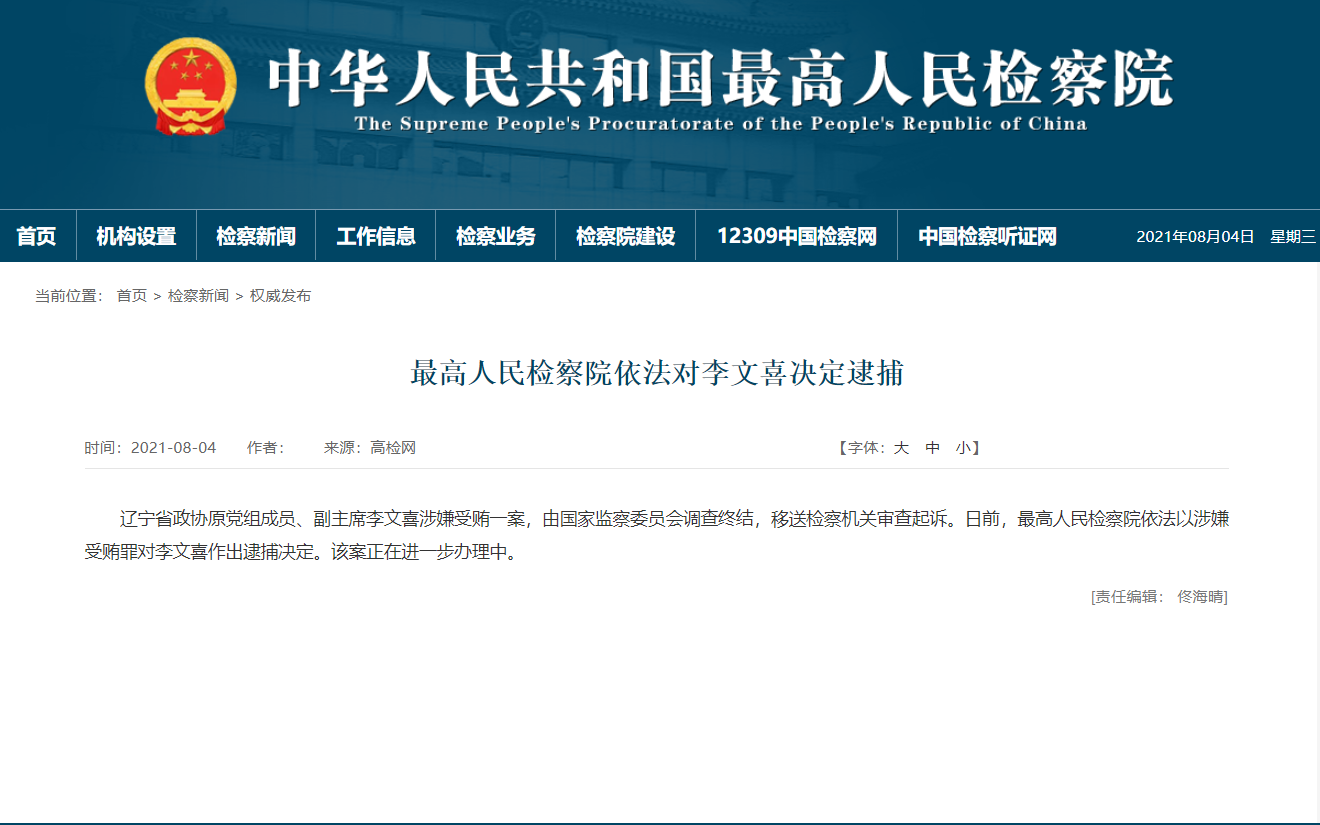 人民网北京8月4日电(薄晨棣)据最高人民检察院官方网站消息,辽宁省政协原党组成员、副主席李文喜涉嫌受贿一案,由国家监察委员会调查终结,移送检察机关审查起诉。日前,最高人民检察院依法以涉嫌受贿罪对李文喜