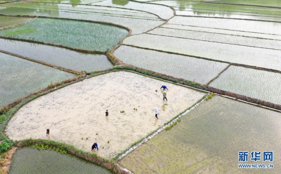 8月2日,在柳州市柳江区穿山镇林寺村,小朋友在稻田里体验晚稻插秧(无人机照片)。 暑假期间,在广西柳州市柳江区穿山镇,一些放暑假的孩子在家人的带领下走进农田,感受劳动的滋味。近期,广西柳州市抢收