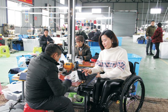 杨淑亭在她的扶贫车间工作。受访者供图 从月入7.7元到担任外贸出口公司总经理,从一个人打拼到带领59名残疾人、380多户贫困户和1386名村民脱贫致富,在第25届“中国青年五四奖章”获得者杨淑亭