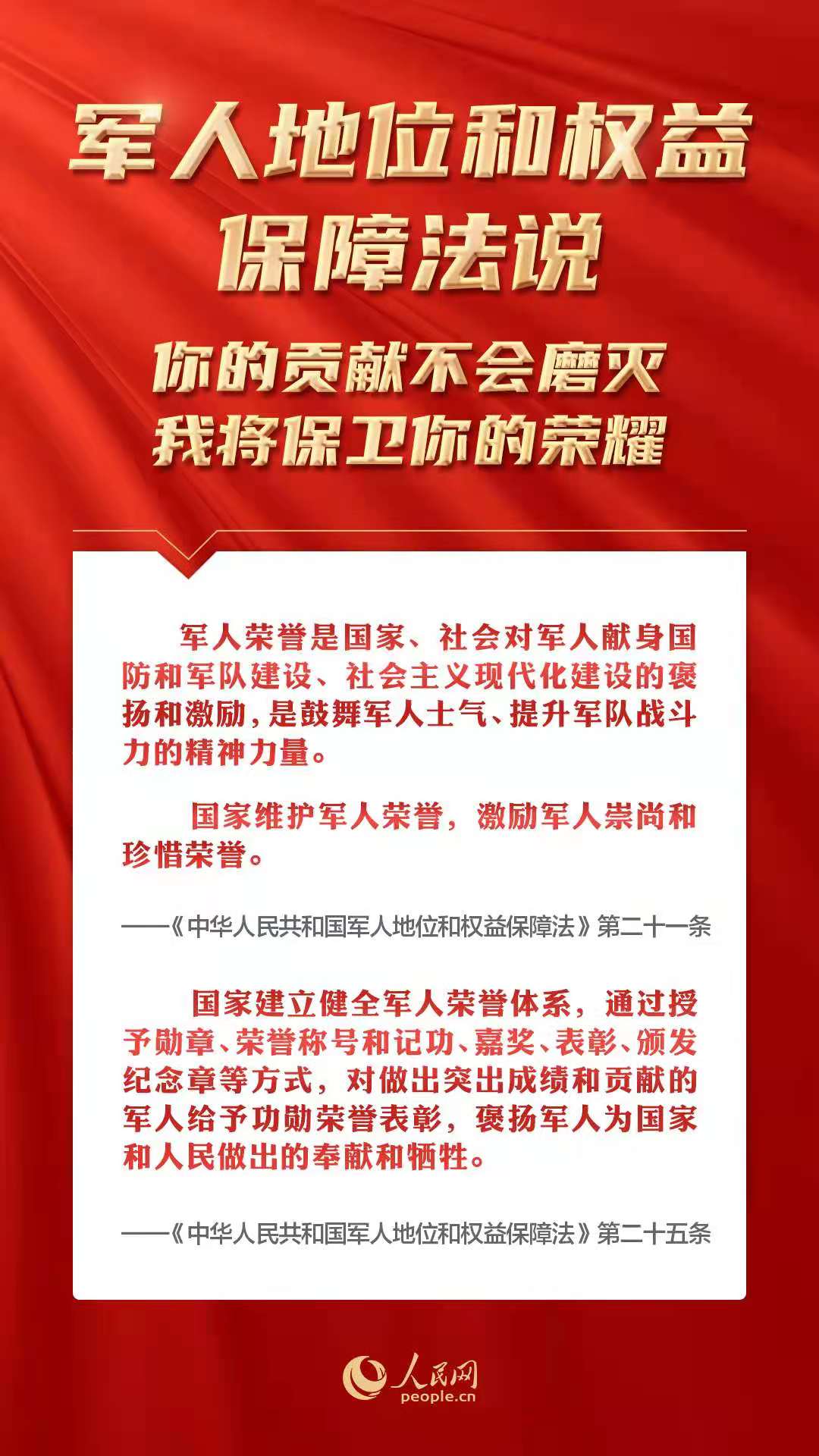 今天是“八一”建军节,一部为最可爱的人而制定的法律――《中华人民共和国军人地位和权益保障法》正式施行。维护军人尊崇地位、保障军人合法权益,事关国防和军队建设,事关国家安全和发展大局。还有哪些保护军人权