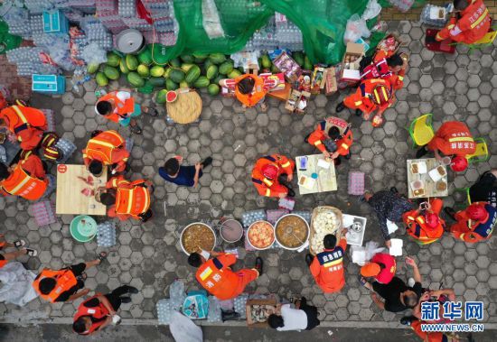 7月28日,救援人员在卫辉市明珠花园小区居民开设的就餐点吃饭(无人机照片)。 “烩菜、面条、绿豆粥,这有饭,大家来吃吧。”河南省卫辉市明珠花园小区外,两口大锅、几张桌子,旁边摆放着做好的饭菜,小
