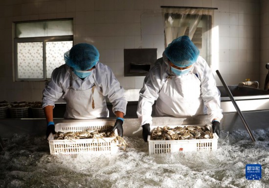12月4日,在泗洪县一水产品出口加工基地,工人在生产车间清洗螃蟹。江苏省宿迁市泗洪县在培植螃蟹产业过程中,高标准建设螃蟹养殖出口示范基地,按照出口订单标准养殖螃蟹。入冬以后,全县螃蟹出口企业全力加工订