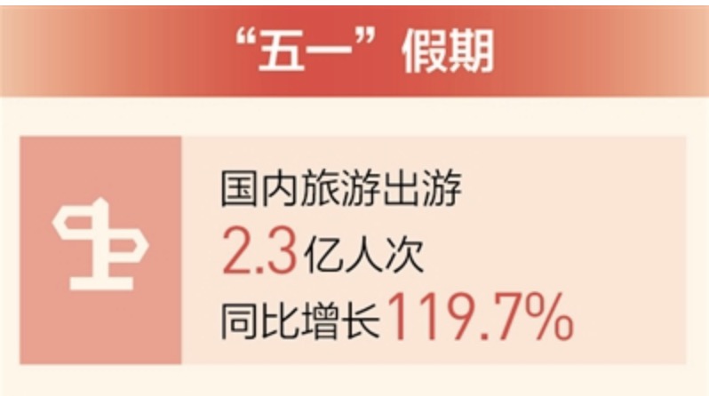 5月5日,今年“五一”小长假落下帷幕,旅游市场也恢复了往日生机。据文化和旅游部测算,“五一”假期全国国内旅游出游2.3亿人次,同比增长119.7%,按可比口径恢复至疫前同期的103.2%;实现国内