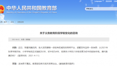 人民网北京4月22日电(记者孝金波)近日,“小学改为5年,初中改为4年”等有关中小学学制变化的网络传言备受关注。4月21日,教育部对此作出回应:目前无相关政策出台。4月11日,有网民在教育部官方网站上