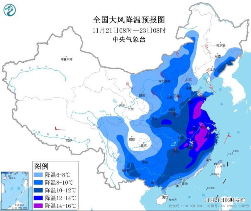 中新网11月21日电据中央气象台网站消息,中央气象台11月21日6时继续发布寒潮蓝色预警:受寒潮影响,11月21日8时至23日8时,我国中东部地区将有4~6级偏北风,阵风7~9级,气温下降6~10