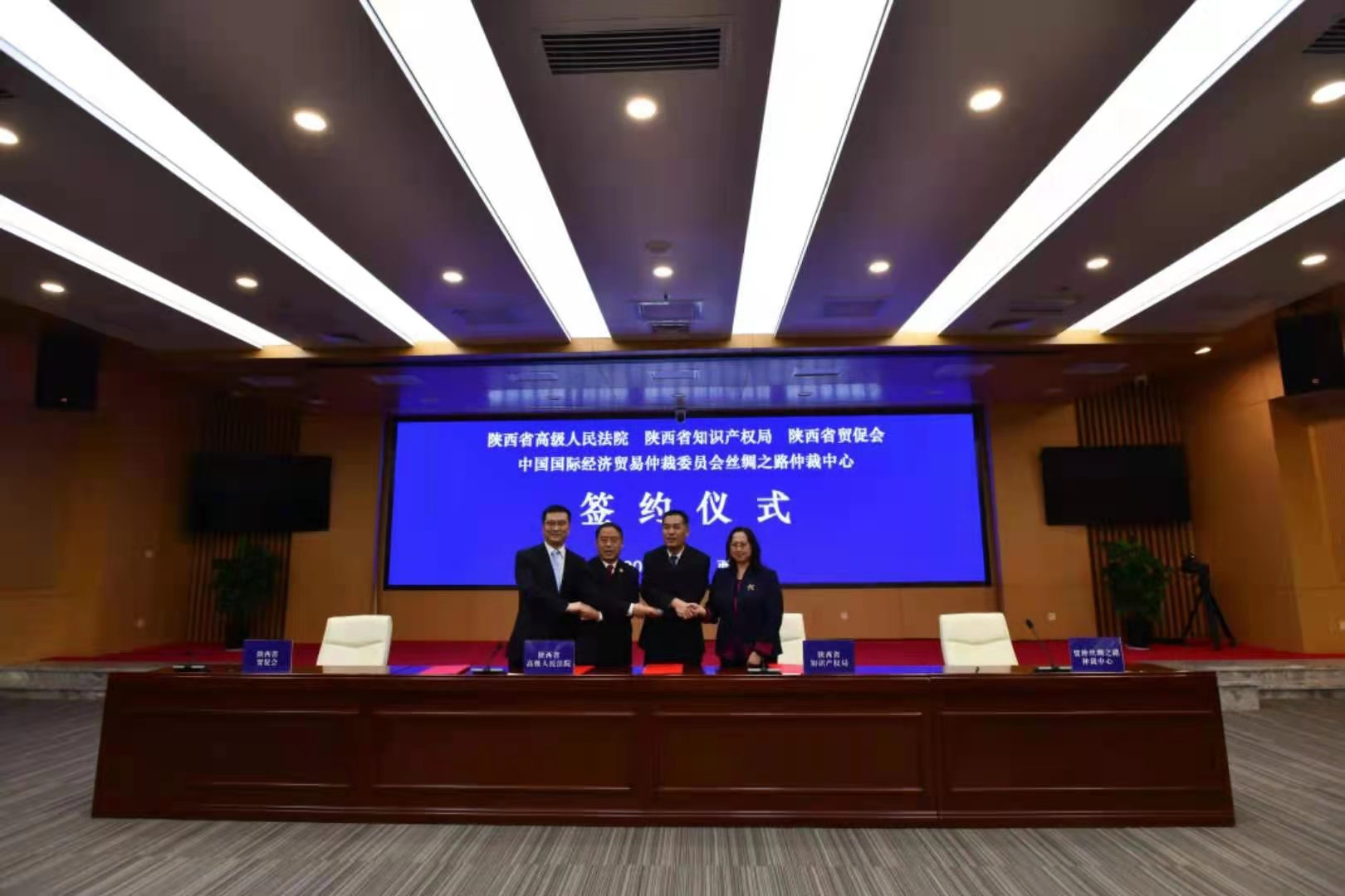 陕西省高级人民法院与陕西省知识产权局、陕西省贸促会及中国国际经济贸易仲裁委员会丝路仲裁中心还签署了《关于建立知识产权调解、仲裁优先推荐机制的框架协议》,旨在强化协同联动,推广“诉讼—行政裁决—仲裁—调解”多元解决方式,逐步形成诉仲对接、诉调对接、仲调对接有效衔接、有机融合、协同共治的知识产权纠纷多元化解决机制。