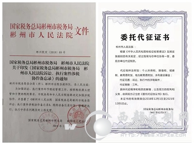 该涉税协作备忘录的签署,标志着自2018年12月1日以后在彬州市人民法院受理的案件,符合个税征收规定的,将按照利息收入依法缴纳个税!该院院长卢玎、市税务局局长侯启江在协作备忘录签字,彬州市人民法院副院长、执行局长吴振华代表法院现场接授税务机关授权的《委托代征证书》。彬州市人民法院在咸阳地区率先推动此项工作开展,大力提升了国家税收的司法保障力度。