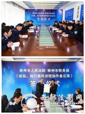 2018年11月27日,彬州市人民法院、国家税务总局彬州市税务局《诉讼、执行案件涉税协作备忘录》签字仪式在 国家税务总局彬州市税务局举行。彬州市副市长尚小刚出席签字仪式,彬州市人民法院院长卢玎及部分法官干警、国家税务总局彬州市税务局局长侯启江及相关部门负责人参加了签字仪式。