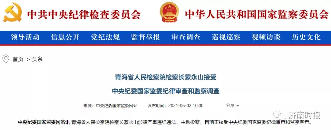 据中央纪委国家监委网站6月2日消息,青海省人民检察院检察长蒙永山涉嫌严重违纪违法,主动投案,目前正接受中央纪委国家监委纪...