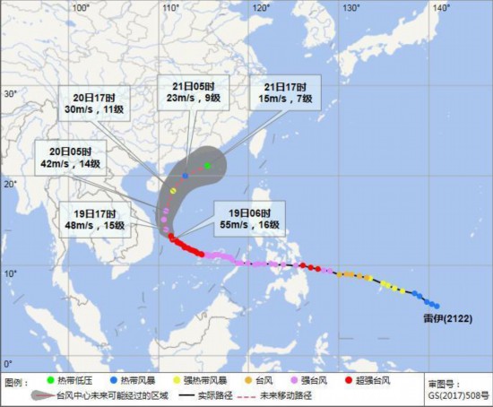 “雷伊”12月19日06时预报路径图。海南省气象服务中心供图据海南省气象台19日介绍,今年第22号台风“雷伊”已于18日14时加强为超强台风级,19日06时其中心距离西沙永兴岛偏南方向约445公里,1